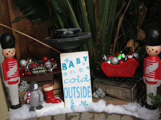 Moving left to right--starting with one of the vintage blowmold soldiers I picked up in Napa last winter. This is my first year displaying them--I absolutely adore them! I tried to get Tyler to buy Ashley a similar pair last year, but he balked. Let's see if he cost her the BIG WIN. This section also features a vintage Santa boot planter.