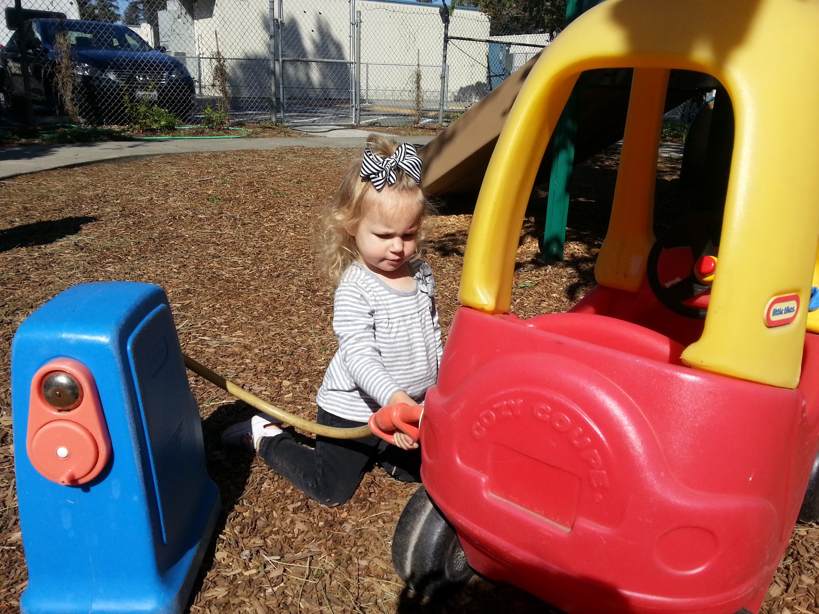She loves to gas up her play car at school. She loves to do all of the things I do during the day.